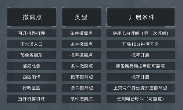 除了这两处撤离点,地图里还存在两个概率撤离点与两个条件撤离点。西区哨卡撤离点(5号撤离点)在地图西侧餐厅附近,郁金香街东的撤离点(3号撤离点),这两个撤离点开启概率为50%。地图北部的邮局北侧撤离点(4号撤离点),要穿戴“民兵胸挂甲”且坚守20秒才能撤离,“民兵胸挂甲”可通过淘汰周边游荡者来获得。地图南部的行政区西撤离点(6号撤离点),上交两枚身份牌并坚守20秒就能撤离。要是在行政楼区域激战后,不想冒险从下水道或直升机撤离,那交身份牌撤离显然是最优选择。