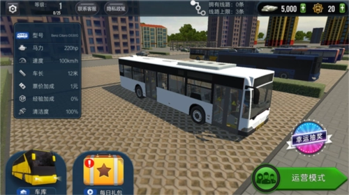 首次进入游戏的玩家朋友,可以在主界面中查看到当前公交车的详细参数,如车型型号、马力、速度、车长、票价加成、经验加成以及车内的清洁度等。