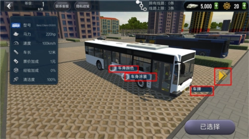 2、在这里我们可以进行颜色的更换和车身的涂装以及车牌,点击右边的三角可以进行购买公交。