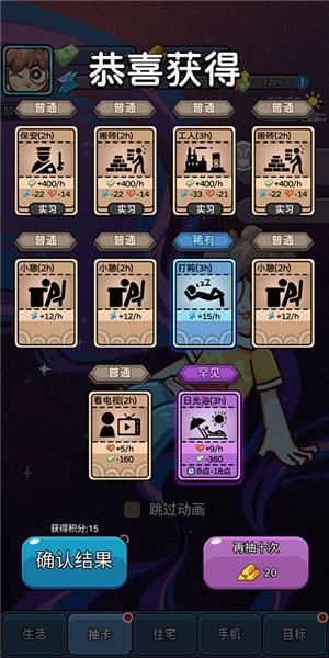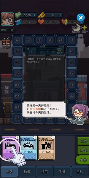 4. 开启之后,时间便会开始流转,同时执行每张卡牌的效果,诸如恢复状态、赚取薪水之类。