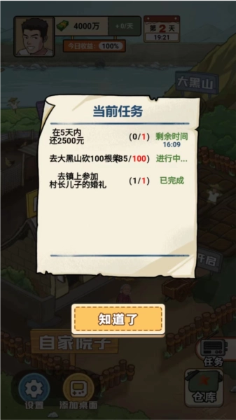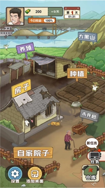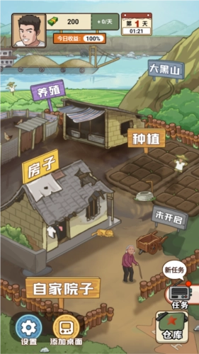 3、来到自家院子的界面,这里涵盖养殖、房子、种植以及大黑山等各类场景,每个场景都设有不同的任务。