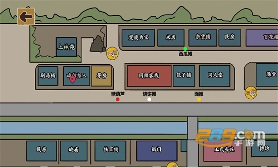6、当进入地图界面后,你能够看到自己当前所处的位置,以及游戏里各个场景与摊子的具体地址。