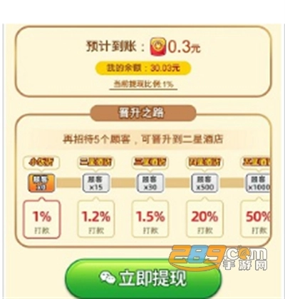 1、红包提现的最低金额设定为0.3元。而且,随着酒店等级逐步提升,相应的兑换比例也会随之提高,如此一来,玩家便能够领取到更为丰厚的红包。