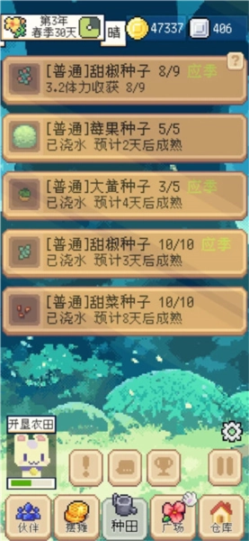 《种田高手》最新版本是一款趣味性十足且拥有精美像素画面的模拟类游戏。游戏内包含诸多有趣内容,玩家能够在此直接迅速开启游戏体验。在《种田高手》安卓版里,玩家将化身为农场主,肩负起经营个人农场的重任。通过种植各类农作物、开展养殖活动以及销售农产品,逐步发展并壮大自身事业。在此过程中,玩家需要精心规划农场布局,挑选适宜的作物与养殖品种,合理安排生产时间与资源,以此提升农产品的质量与产量。