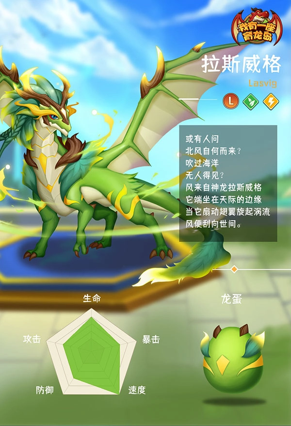 龙岛上存在着十种属性的魔法,分别为自然、火系、水系、电系、土系、钢铁、黑暗、光明、心灵以及混沌。每一条龙都会掌握一种或者两种属性。在育龙山上,能够挑选任意两只等级在4级及以上的龙来进行两两培育。依据所选龙的不同属性组合,便可以培育出对应元素组合的全新龙蛋。举例来说:一只具有【自然】属性的龙和一只拥有【火系】属性的龙,它们有可能培育出【自然】属性、【火系】属性,或者是【自然+火系】属性这三种组合中的某一种龙蛋。