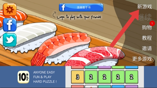 1. 设有功能选项,需点击“新游戏”才能进入。进入后,会展示寿司食材并给出难度提示,呈现出模拟经营或益智玩法的启动场景。