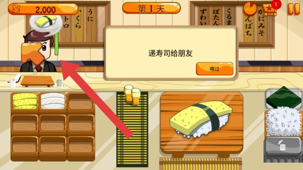 2、第一天经营进度,依据点饭的操作指引与略过按钮,结合寿司店的食材如米饭、海苔等,以及日文菜单装饰,展现模拟经营寿司店的过程。