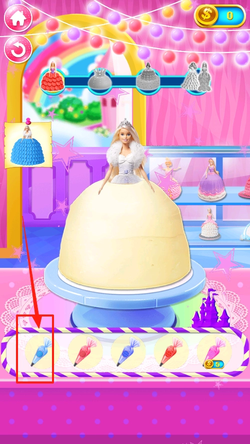 2. 挑选工具来装饰蛋糕,在下方的工具栏中选取装饰物品,为娃娃蛋糕增添细节,感受装饰机制。