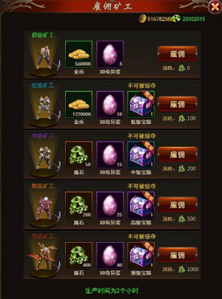 只需轻点神秘矿工下方的【生产】按钮,就能开启矿工雇佣界面。每位玩家每日拥有3次雇佣矿工的机会。矿工共分五种品质,品质等级越高,获取资源的速度就越快。同时,矿工品质越高,雇佣所需花费的魔石也就越多,不过雇佣初级矿工则无需消耗魔石。