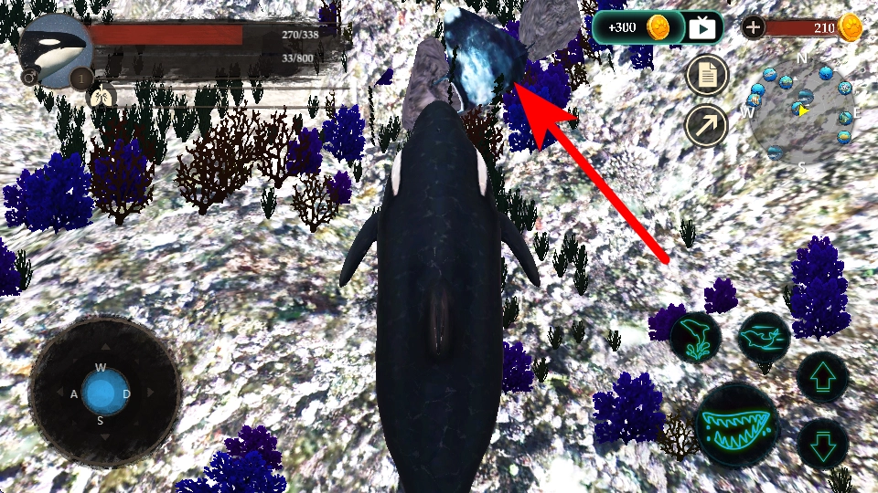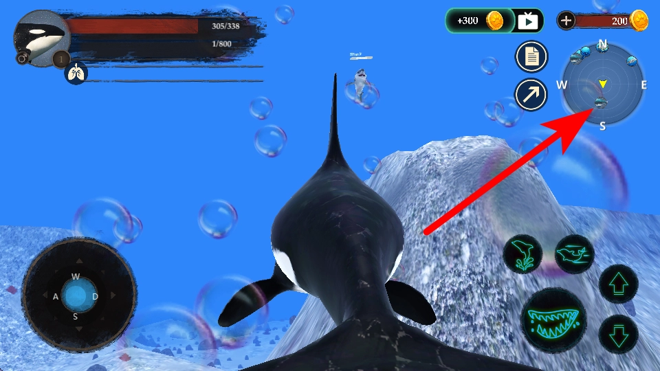 1. 通过右上角的地图,查找目标地点,向着存在其他海洋生物的区域行进,寻觅互动或捕猎的时机。