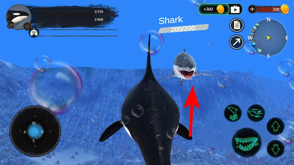 2、当遭遇类似鲨鱼这般的生物时,能够借助操作按钮来展开互动或者进行捕猎,同时要留意观察对方的状态。