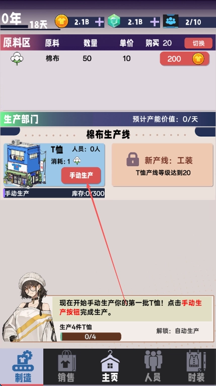 1. 进入游戏,查看“0年18天”这类信息,接着点击手动生产按钮,启动T恤的生产流程。