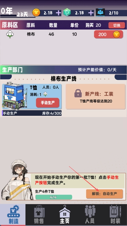 2. 当完成4件T恤的生产后,点击“解锁自动生产”按钮,以此提高生产效率。