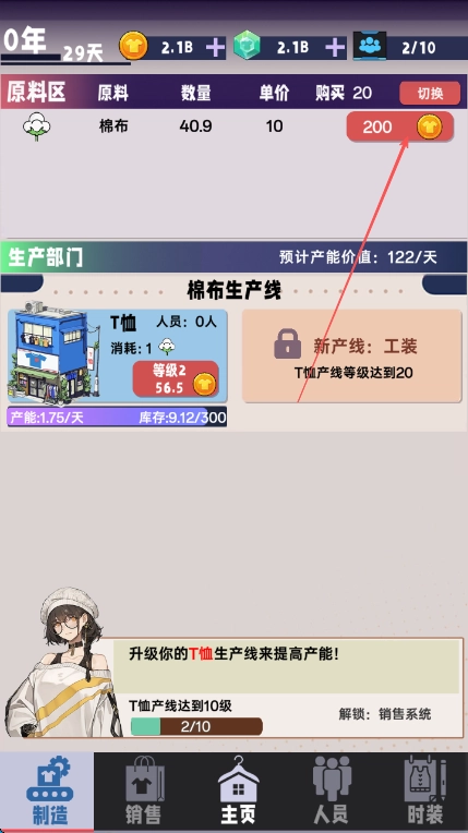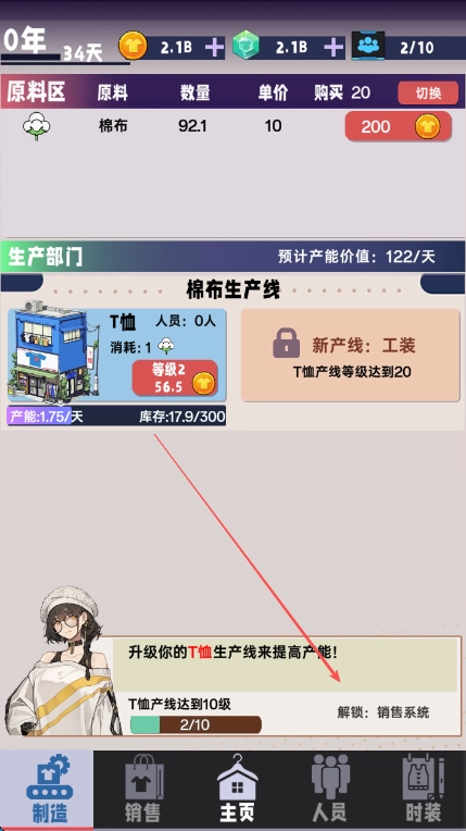 4、通过积累资源来对T恤生产线进行升级,达成T恤生产线升至10级的目标,进而解锁销售系统。