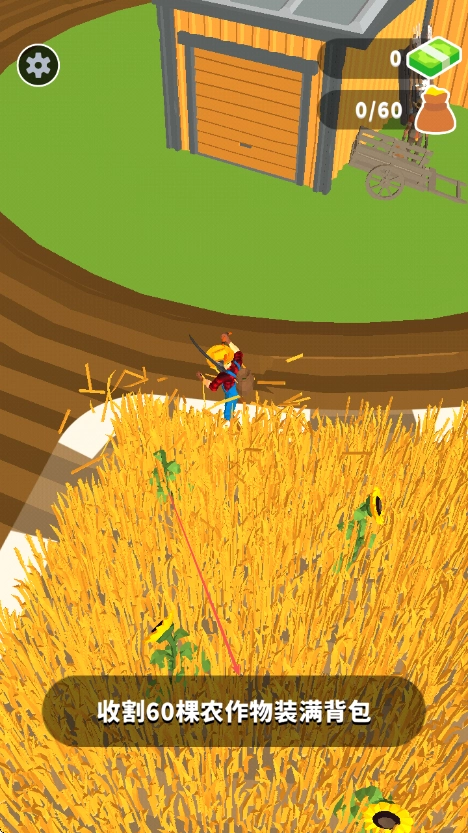 2、于麦田里移动,持续对农作物进行收割,关注屏幕右上方所显示的已收割数量,例如28/60 。