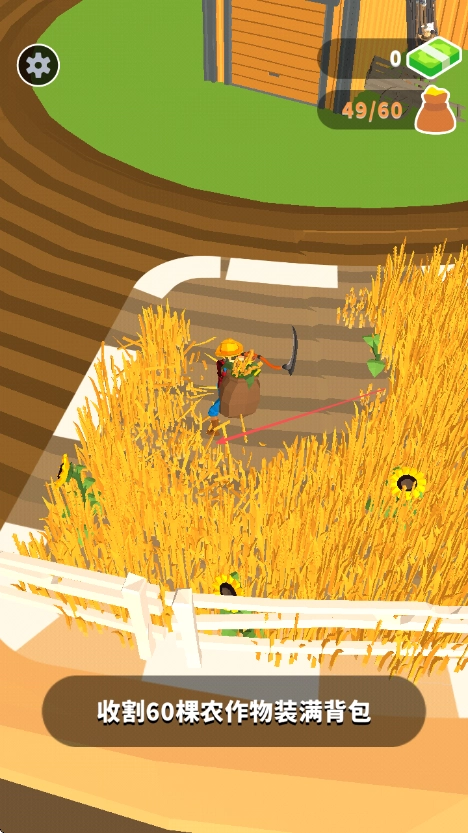 1. 开启游戏后,操控游戏角色步入麦田,依照提示收割60棵农作物,待背包装满后,正式开始收割行动。