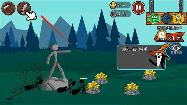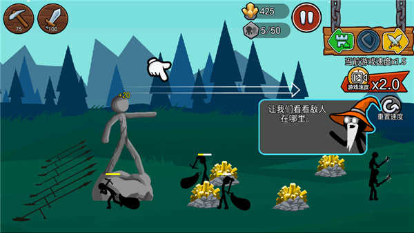 2、你可以让你的军队组成编队,也能指挥单个单位,每个火柴人都在你的掌控之下。在这里,你能够建造各种单位,开采黄金资源,还能让火柴人学习剑术、枪矛技巧,训练出弓箭手、法师,甚至是巨人。努力去摧毁敌人的雕像,将所有领土都纳入囊中。