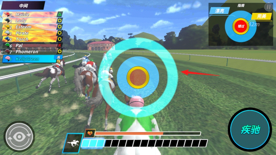 6、每当成功完成一个圆圈,下方的能量条就会增长一小截。当能量积攒到一定程度时,便可点击右侧的疾驰按钮,提高马匹的速度,助你超越对手。