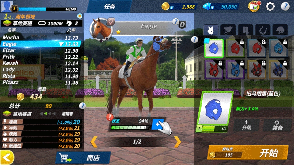 4、在比赛开始前,你能够对马匹进行升级操作,同时给它穿戴好装备,以此保证赛马处于最佳状态。准备工作完成后,点击“开始”按钮,即可进入比赛。