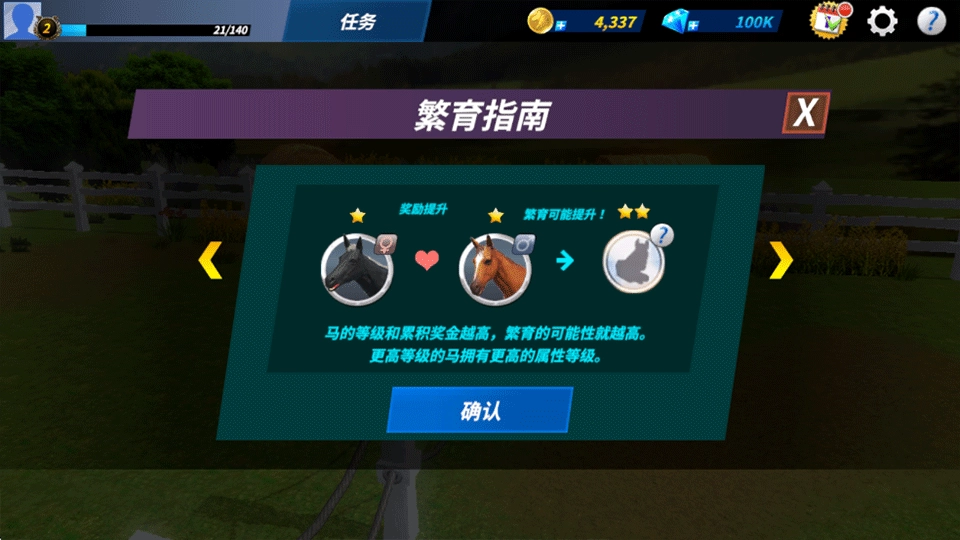 8、玩家除了参与比赛,还得进行小马的培育。马匹等级越高,累计奖金越多,繁育新马的可能性也就越大。而且,高等级的马匹具备更为强大的属性与战斗能力。