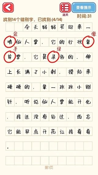 1、进入游戏,在每一项关卡挑战里,都有一篇作文供玩家找出其中的错别字。