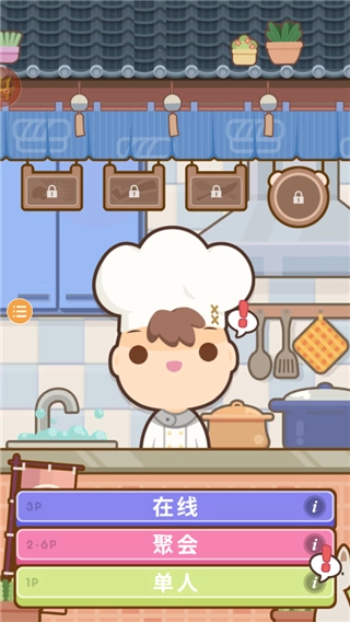 打开上菜啦,进入主界面后能看到“在线”“聚会”“单人”三种模式,玩家可以依据自身需求挑选模式来开展游戏。