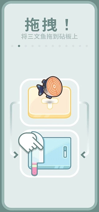 在屏幕上长按拖动,将取出的三文鱼拖拽到砧板上。