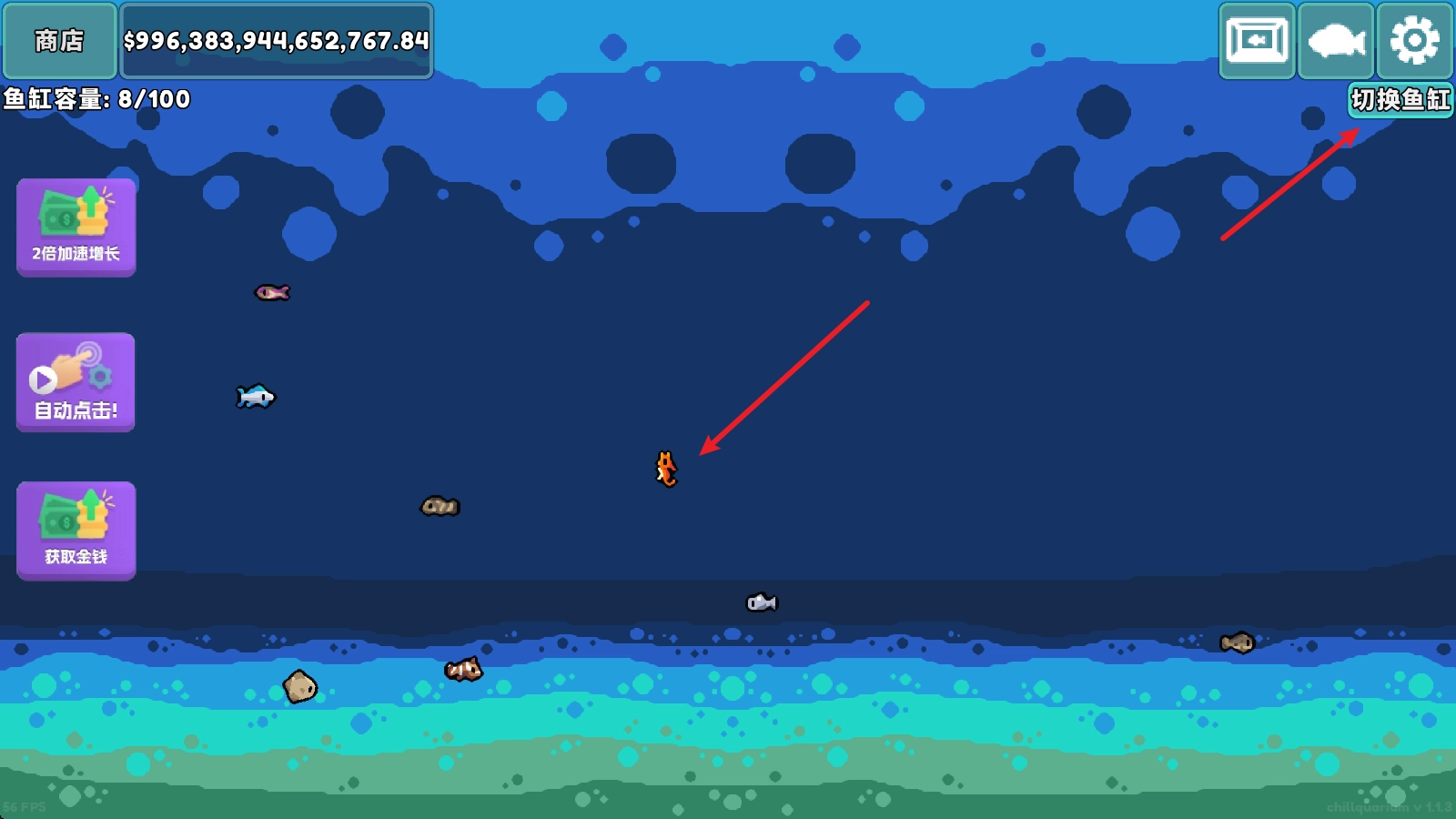 在商店的升级界面里,我们既能升级鱼粮,也能购买并升级其他鱼缸。