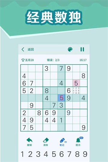 全民玩数独是南京莫邪网络科技有限公司推出的一款超有趣的数独休闲游戏,涵盖入门到大师级的难度梯度,设有每日挑战和限时赛模式,助力玩家锻炼逻辑思维能力。游戏配备智能提示与错误检测功能,还支持笔记标记及自定义主题皮肤。操作简便易上手,喜爱数独的朋友们,欢迎前来体验!