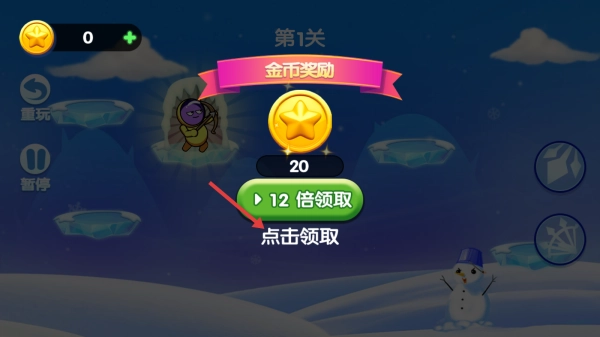 完成当前关卡后,可点击指定按钮领取基础奖励,也能通过观看额外内容获取双倍奖励,之后还能选择进入下一关继续游玩。
