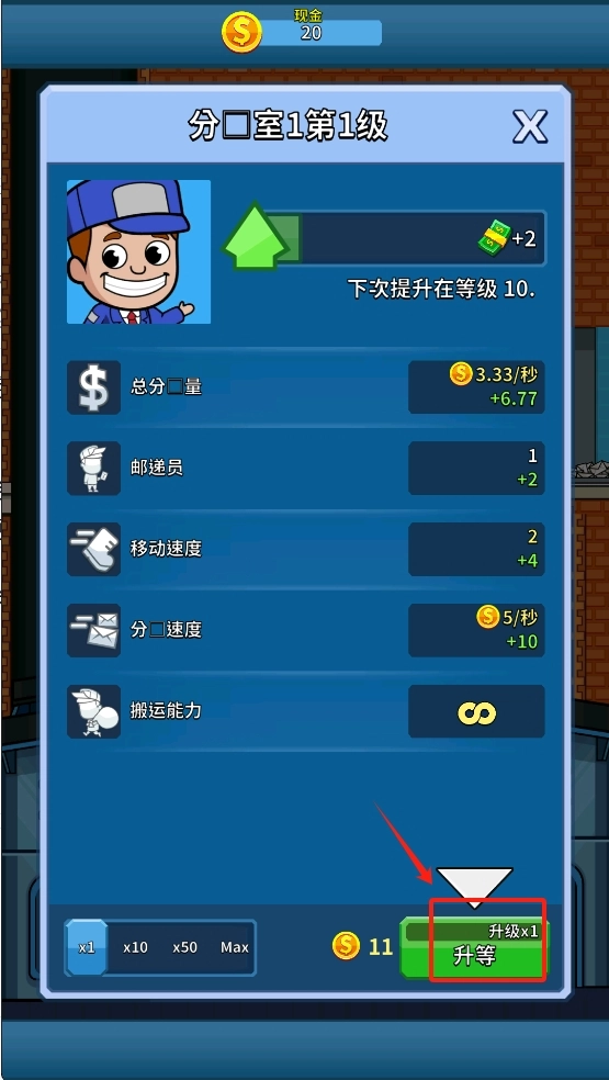 在游戏里找到那个写着“升级”的按钮点一下,消耗11个金币就能让分口室的等级往上提一提,这样每秒能拿到的收益就会变多,对推进游戏进度也有帮助。