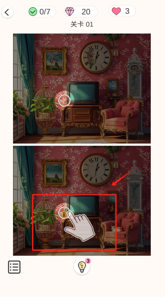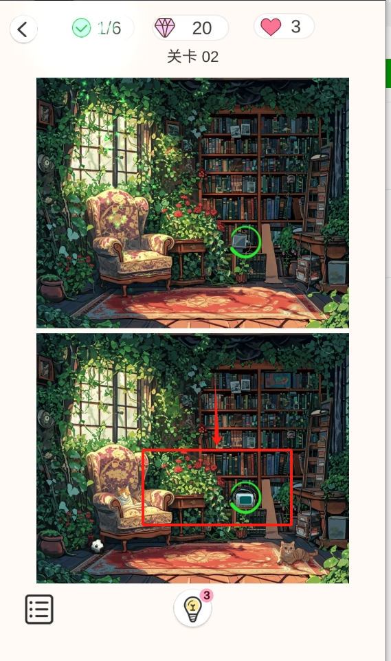 对比上下两张绿植房间的图片,找出被绿圈标注的不同地方,顶部会显示关卡进度以及道具数量。