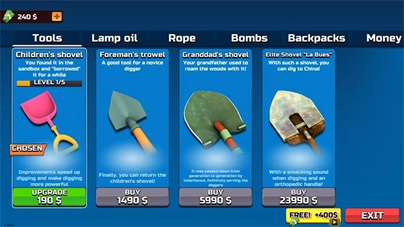 可以用金币来换取更厉害的挖矿工具,也能给现有的装备做升级,让干活的速度变快。