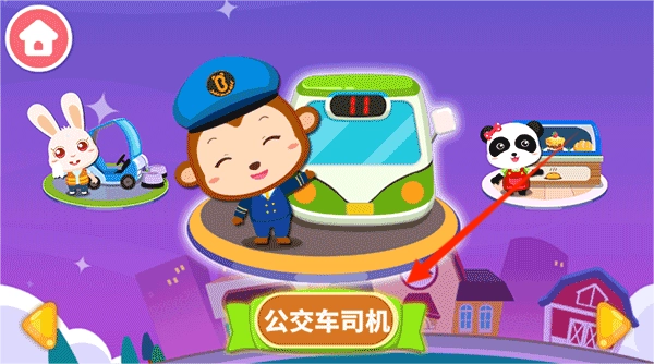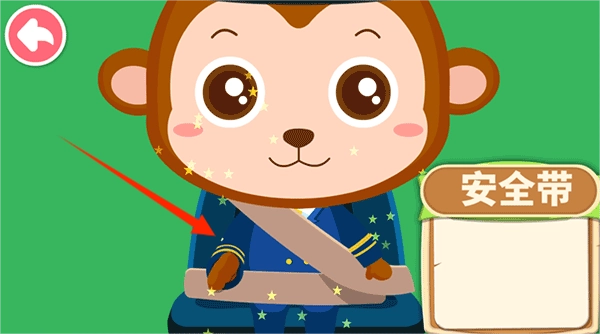 挑选公交司机的角色,为小猴系好安全带,进行模拟驾驶操作,顺利完成搭载乘客的任务。