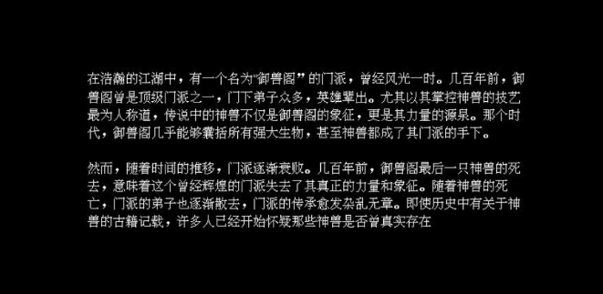然而,随着岁月流转,这个门派渐渐走向了衰败。数百年前,御兽阁最后一头神兽的殒命,宣告着这个曾煊赫一时的门派彻底失去了它真正的力量根基与精神象征。神兽逝去后,门内弟子也纷纷离散,门派的传承变得愈发混乱无序。即便史书典籍中仍留有关于神兽的记载,可如今不少人已开始质疑那些神兽是否真的在世间存在过。