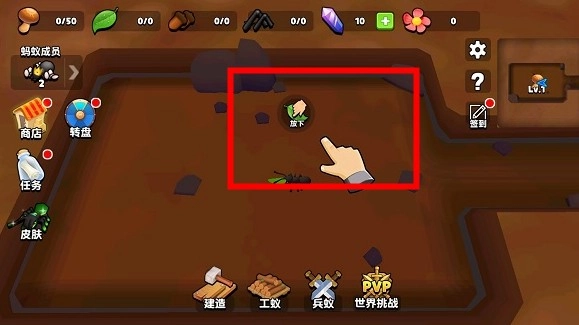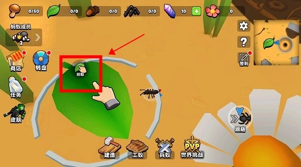 收集树叶:指挥蚂蚁到外面去采集树叶,点击「拾取」按钮后让它们回到蘑菇加工间。
