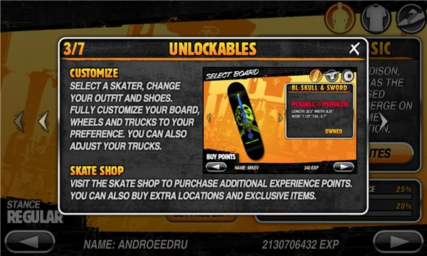 你可以从8位角色里挑选,然后按照自己的喜好来进行全面的自定义。无论是服装还是滑板鞋,都能选到你最钟爱的装备。这里有丰富的滑板、支架、滑板轮和轴承可供挑选,道具的合作厂商有Airwalk、PowellPeralta、Bones、TorkTrux以及IronFistClothing。