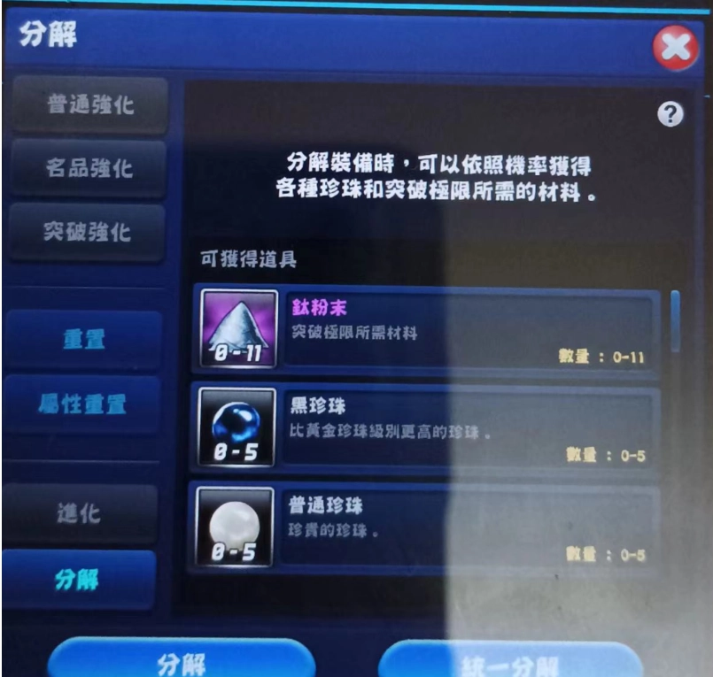 然而我得说,突破强化开放之后,这样的数值或许在新人阶段还勉强能用,但对于高阶玩家而言,其实已经不足以应对全新的游戏环境了,所以进行突破强化是绝对有必要的。突破强化以强化+10时的「大鱼加成/OO大鱼奖励」作为基础值,每往上突破一级,能力就会增加0.2%。我建议只要是用来挑战大鱼的装备,最低至少也要突破强化到+13以上,如果可以的话最好能到+15以上。