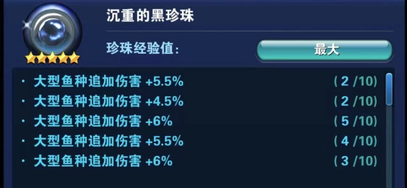 首先,一颗合格的「大鱼珠」,必须是发育成熟的五星珍珠,并且自带三条及以上的「大鱼加成」属性。(单条「大鱼加成」的上限是1.75%,两条的上限是3.5%,所以至少需要三条以上才有可能合格。)也就是说,一颗三星珍珠至少得有一条「大鱼加成」,四星珍珠至少得有两条「大鱼加成」,不然就可以直接磨成珍珠粉了。另外,要随时留意「大鱼加成」的总和,单条「大鱼加成」最高只有1.75%,要是已经清楚不可能达到标准,也请直接分解成珍珠粉。