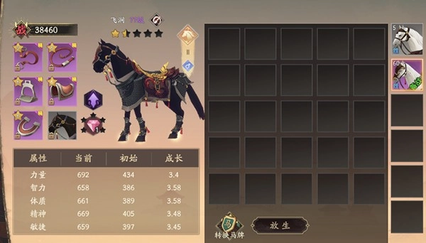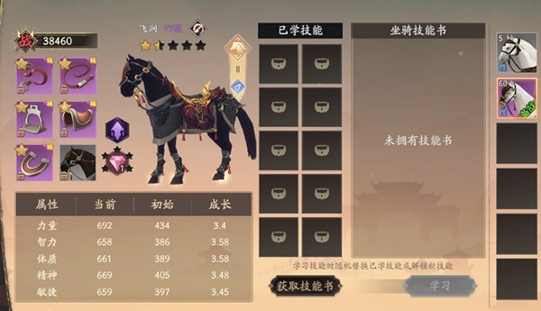 对马匹进行改良,能够提升坐骑在力量、智力、体质、精神和敏捷这五个方面的属性。