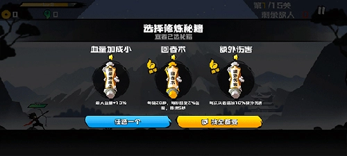 每次升级后,系统会随机生成三本不同的修炼秘籍供选择,大家只需从中挑选一本即可。