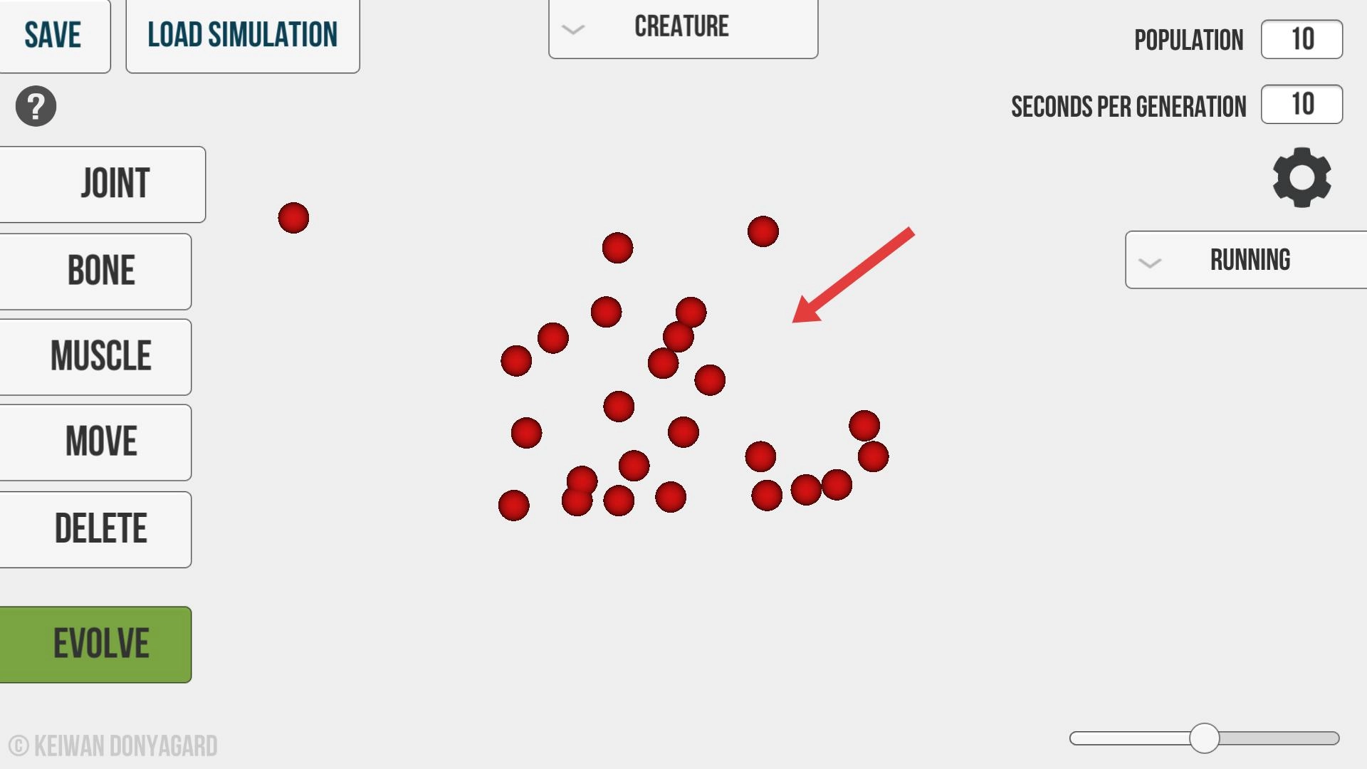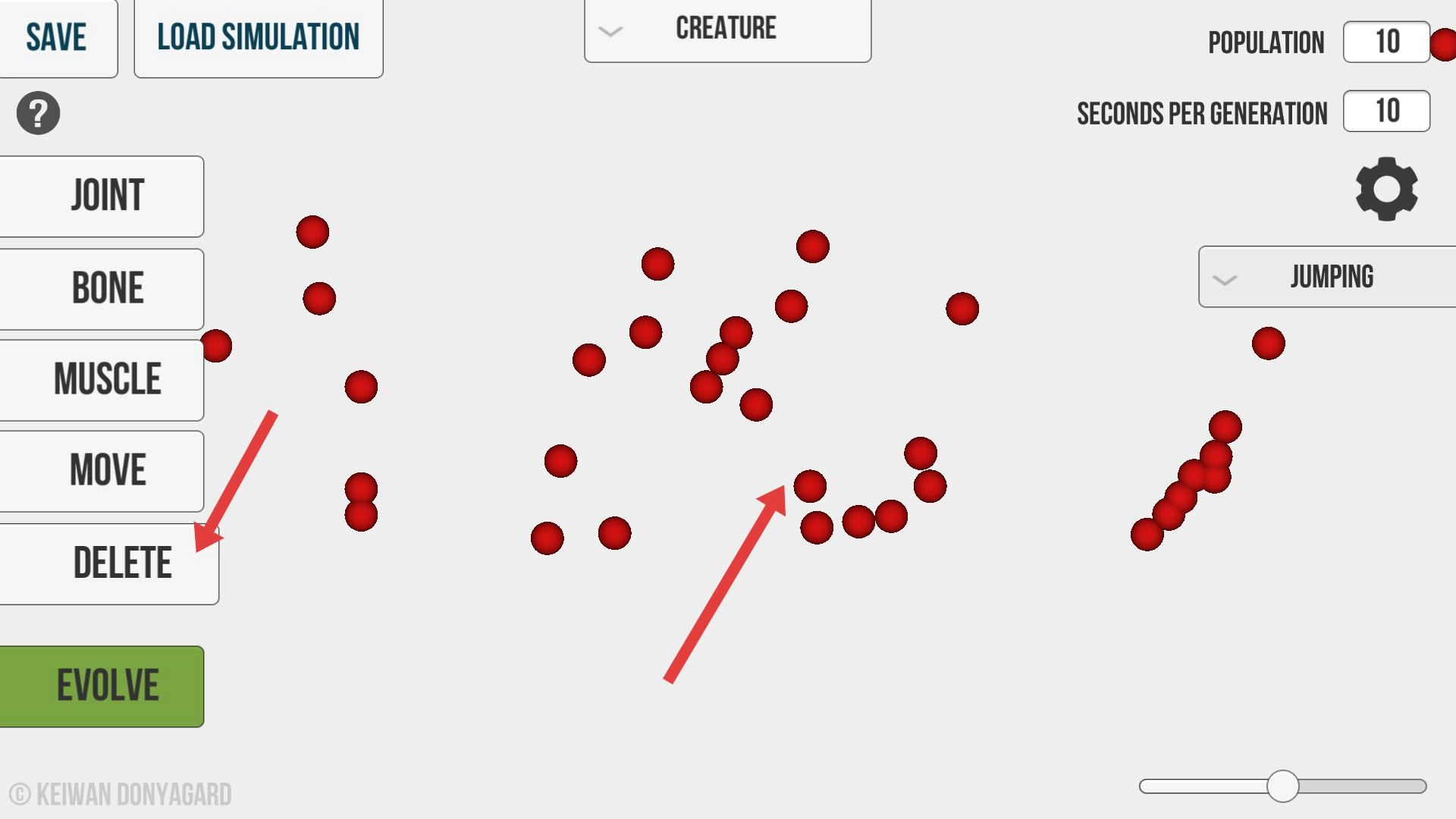 要是发现有多余或者不合适的圆点,点击DELETE键就能把它们删掉,这样可以优化生物的结构,让生物在之后的JUMPING等状态下能够更顺畅地活动。