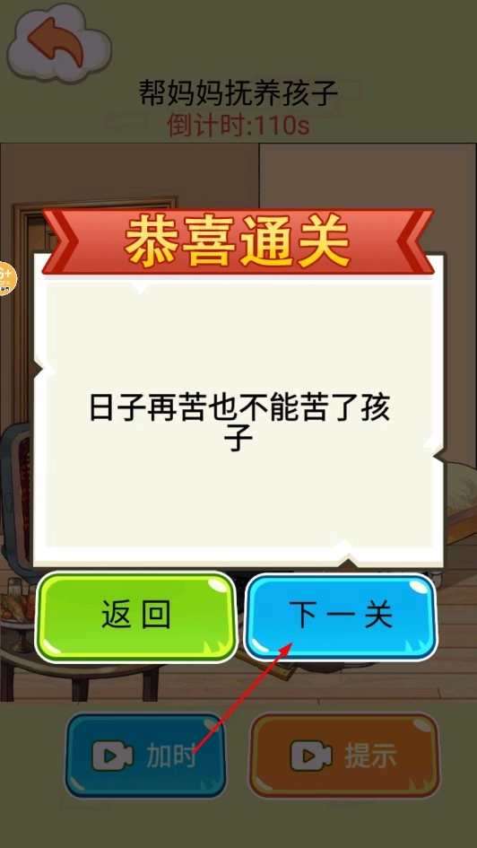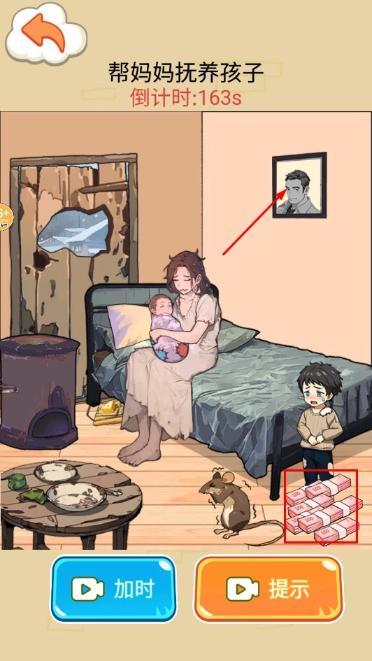 按照提示,把钞票道具拖到孩子那里,以此满足抚养所需,在倒计时结束前高效利用钞票来提供帮助。