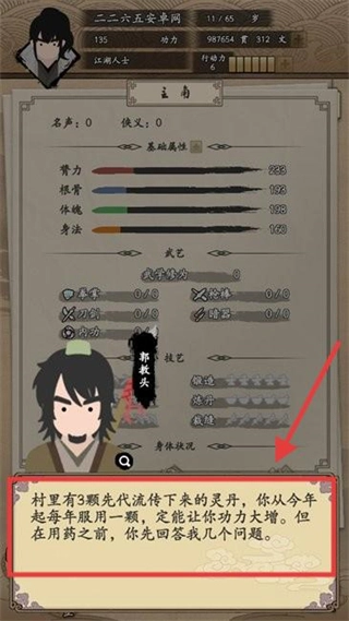 遇到郭教头时,得先完成他提出的问题,之后每年服用一颗【灵丹】,就能逐步提升自身功力,为江湖历练提供助力。