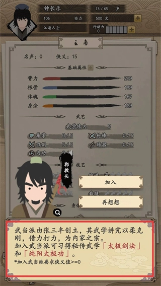 当满足【侠义值】≥0的条件后,若选择加入武当派,即可习得【太极剑法】与【纯阳太极功】,从而提升自身的武学修为。