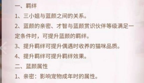 宠物的获取途径是蓝颜偶遇,其品质与蓝颜的羁绊等级挂钩,因此前期建议重点提升一位蓝颜的羁绊等级,以获取品质更优的宠物。此外,蓝颜的亲密度也会对猫咪成年后的属性产生影响。