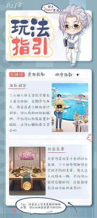 派对娱乐:三小姐在忙碌的工作之余,别忘了适时放松身心。无论是参与热闹的派对,还是和萱萱小鲜肉一起玩乐,都能让你放松精神。这样不仅能收获满满的能量与愉悦,还能赚取更多资金呢~ 外出觅食:美食可是吃货千金的动力源泉,三小姐每周都能去探索不同的美味。每天尽情享用一顿大餐,不仅能获得兑换积分,还能得到具有奇妙功能的道具哦。