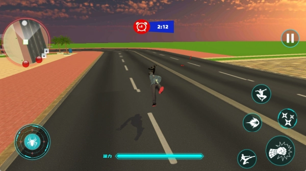 搭配激昂的背景音乐与动感的动作音效,强化高空穿梭与格斗打击的爽感,全方位渲染超级英雄的热血冒险氛围。