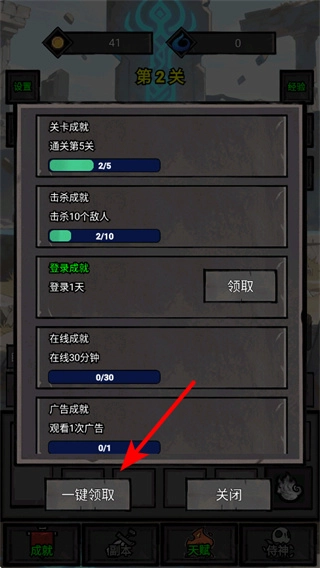 完成关卡后进入成就界面,点击一键领取按钮,就能拿到对应的成就奖励,这是快速获取资源的便捷操作。