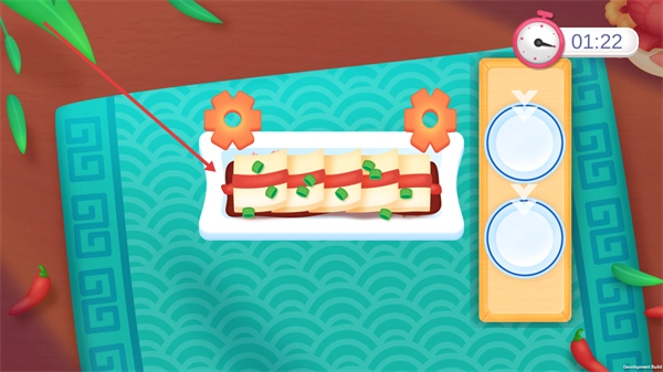 红箭头所指的是摆盘区域,在此需完成指定菜品摆盘的收尾环节。